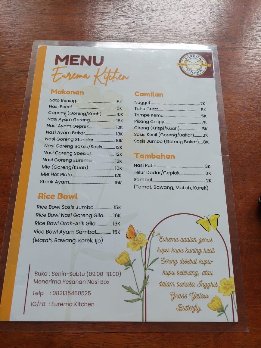 At eurema kitchen, the menus are a delightful showcase of local flavors, prominently featuring economical options such as soto ayam, ayam geprek, ayam bakar, mie goreng hot plate, and nasi goreng. Each dish promises an explosion of taste that transcends the ordinary. Imagine savoring a bowl of soto ayam, where the fragrant broth envelops tender chicken, complemented by a medley of aromatic spices that dance in your mouth with each spoonful. Or indulge in the irresistible ayam geprek, where the crispy fried chicken is smashed and slathered with spicy sambal—an explosion of crunch and heat that’s sure to tantalize your taste buds!